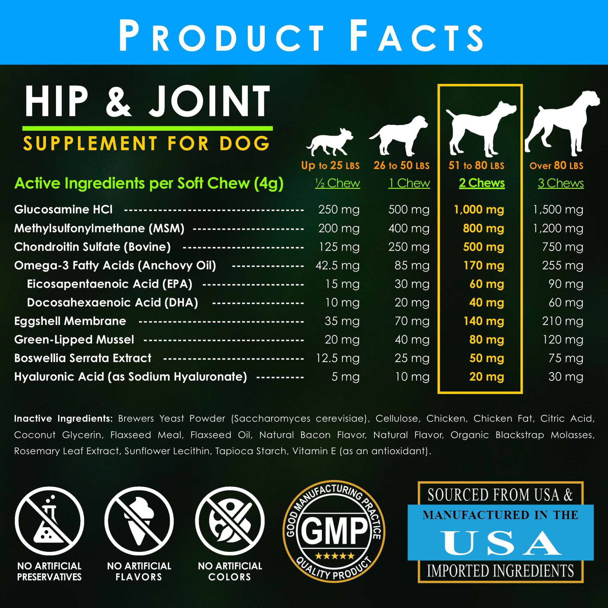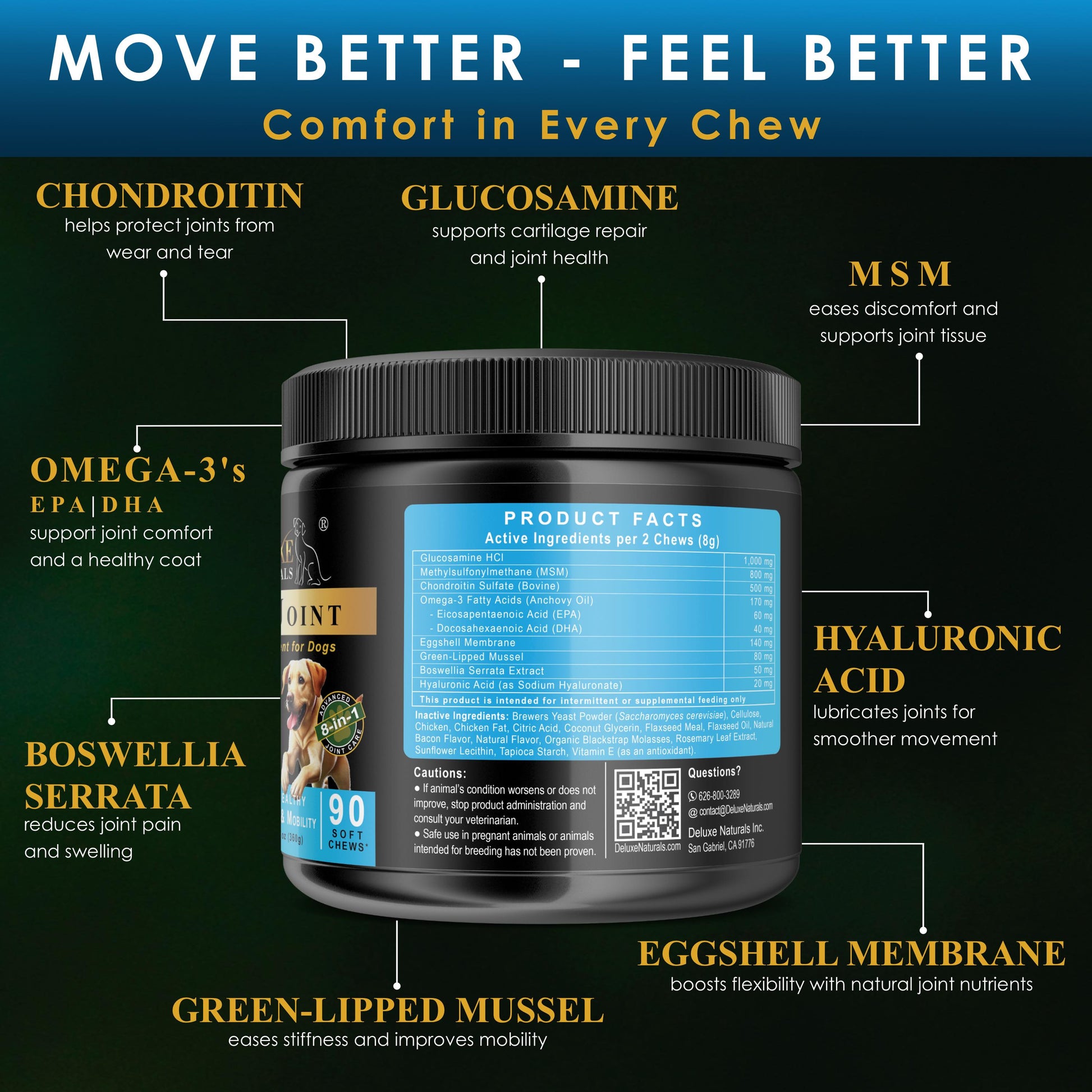 Powerful Active Blend – Glucosamine, MSM, Chondroitin, Omega-3 (EPA & DHA), Hyaluronic Acid, and more for hip and joint care.
